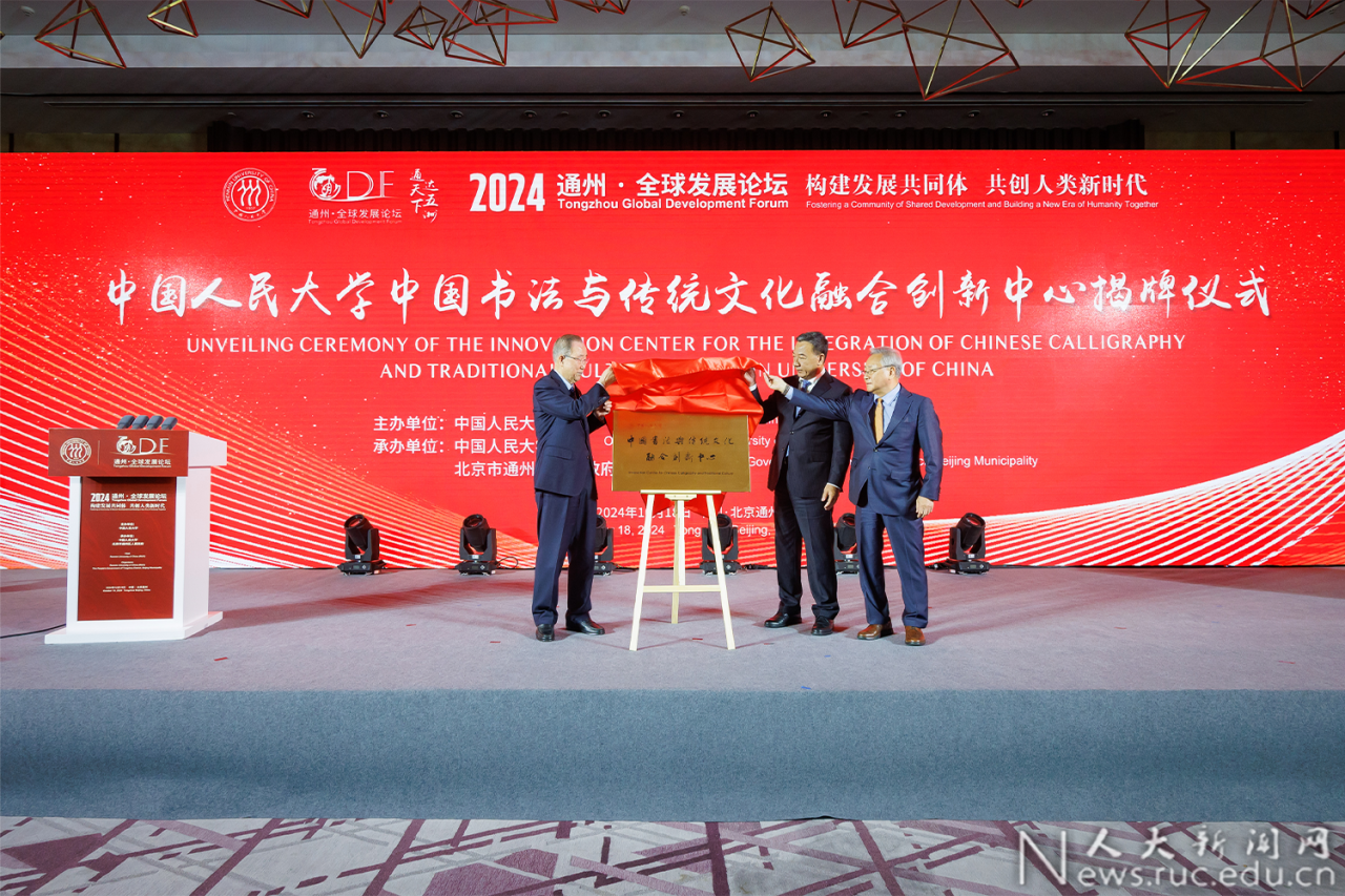 欢迎仪式上,潘基文、张东刚和潘基文基金会北京代表处首席代表金塾共同为春水堂 中国书法与传统文化融合创新中心揭牌。中心旨在传承和发扬书法这一熔铸中华文明精神的艺术瑰宝,深化文明交流互鉴,弘扬全人类共同价值,让世界人民共享中国书法这一文化瑰宝。